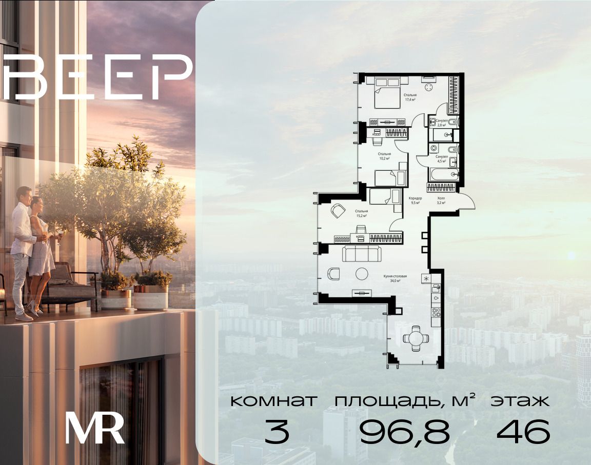 Продаётся 3-комнатная квартира общей площадью 96.80 м² без отделки в ЖК Веер на 46-м этаже 59 этажного дома.