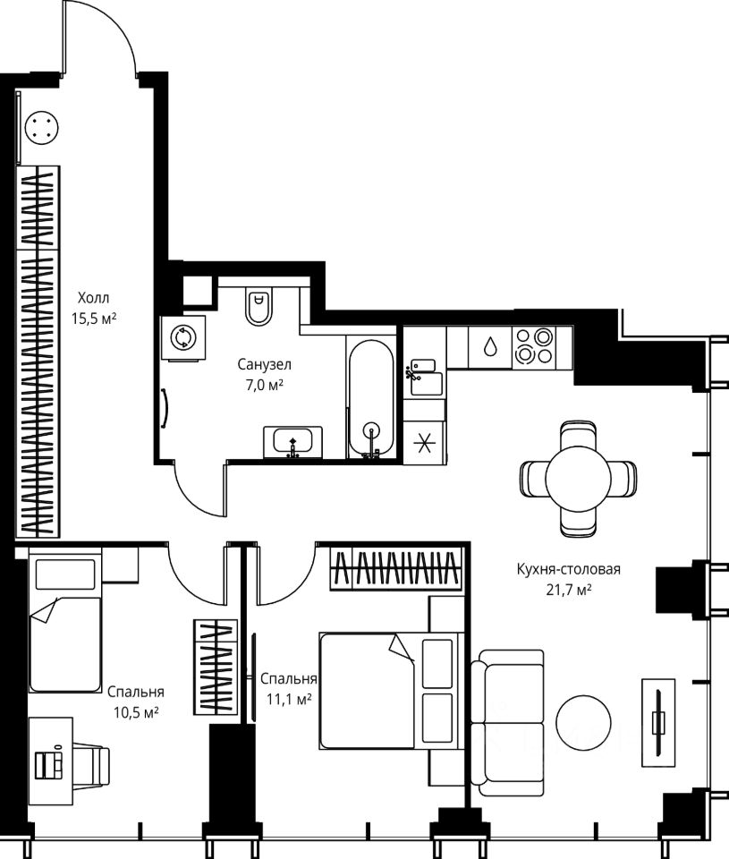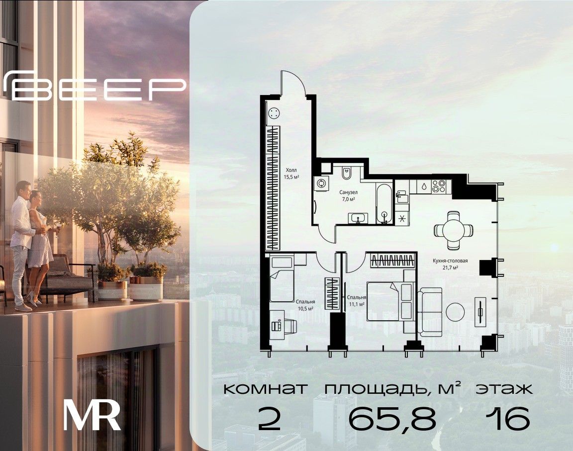 Продаётся 2-комнатная квартира общей площадью 65.80 м² без отделки в ЖК Веер на 16-м этаже 59 этажного дома.