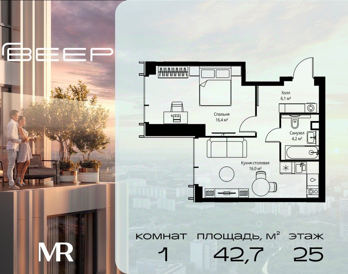 Продаётся 1-комнатная квартира общей площадью 42.70 м² без отделки в ЖК Веер на 25-м этаже 59 этажного дома.