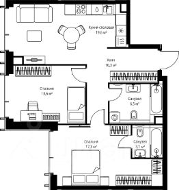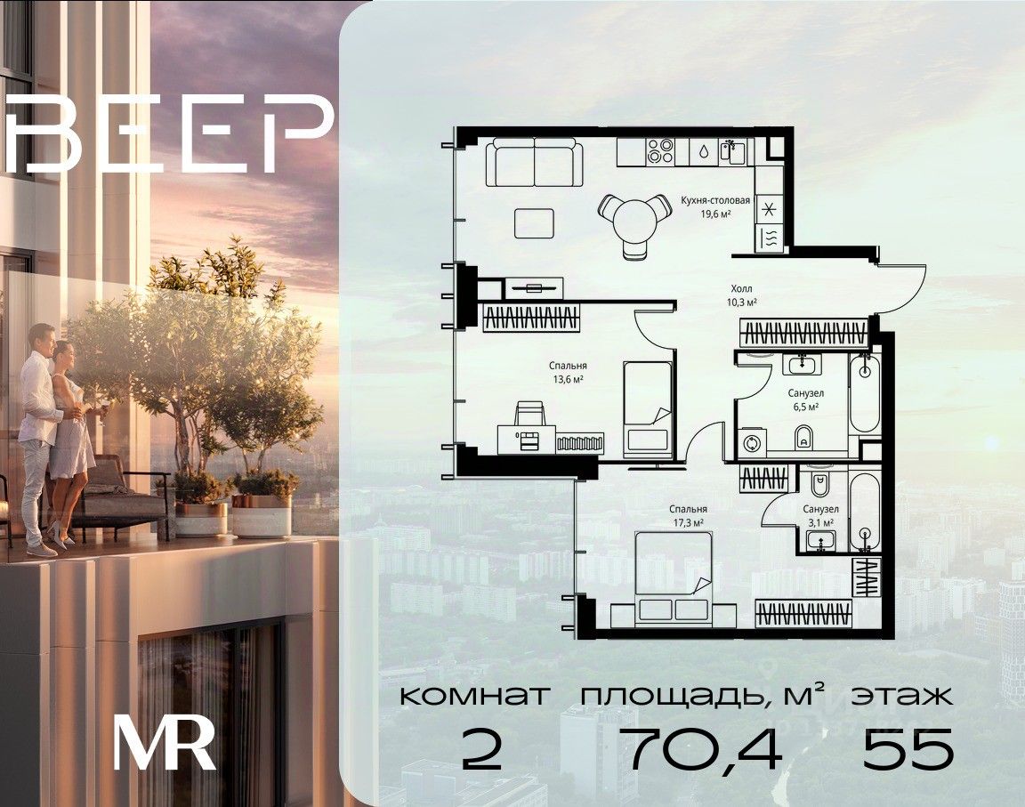 Продаётся 2-комнатная квартира общей площадью 70.40 м² без отделки в ЖК Веер на 55-м этаже 59 этажного дома.