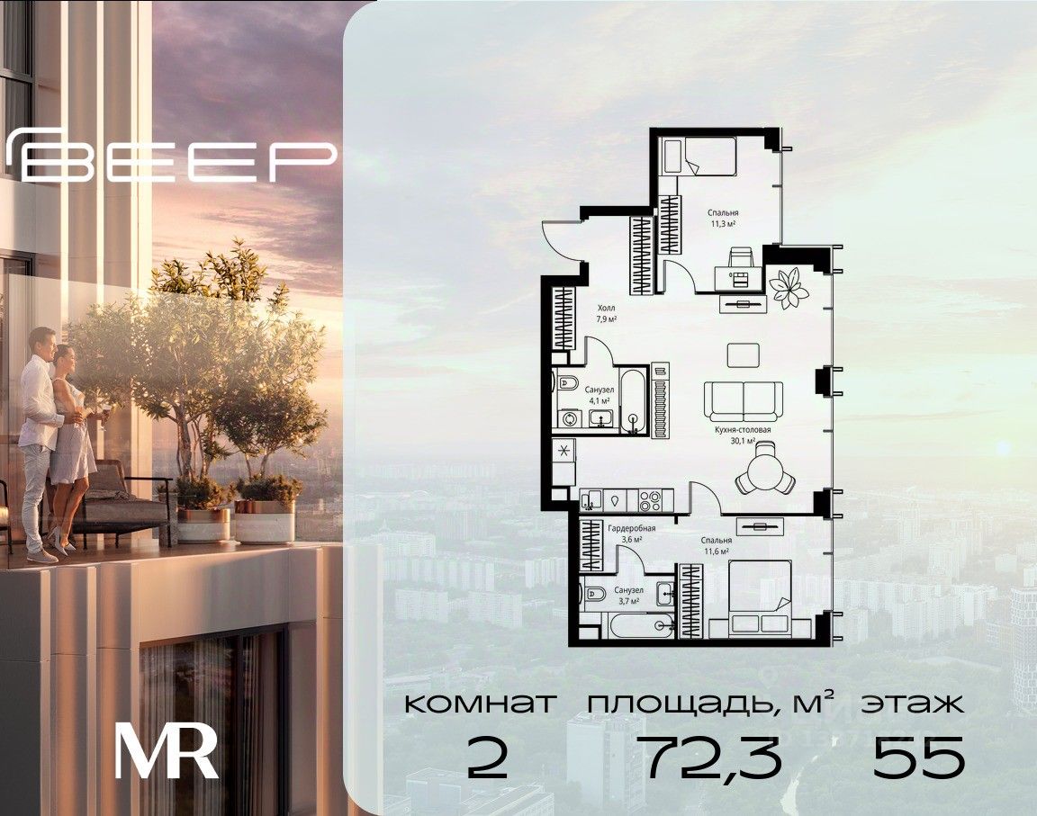 Продаётся 2-комнатная квартира общей площадью 72.30 м² без отделки в ЖК Веер на 55-м этаже 59 этажного дома.