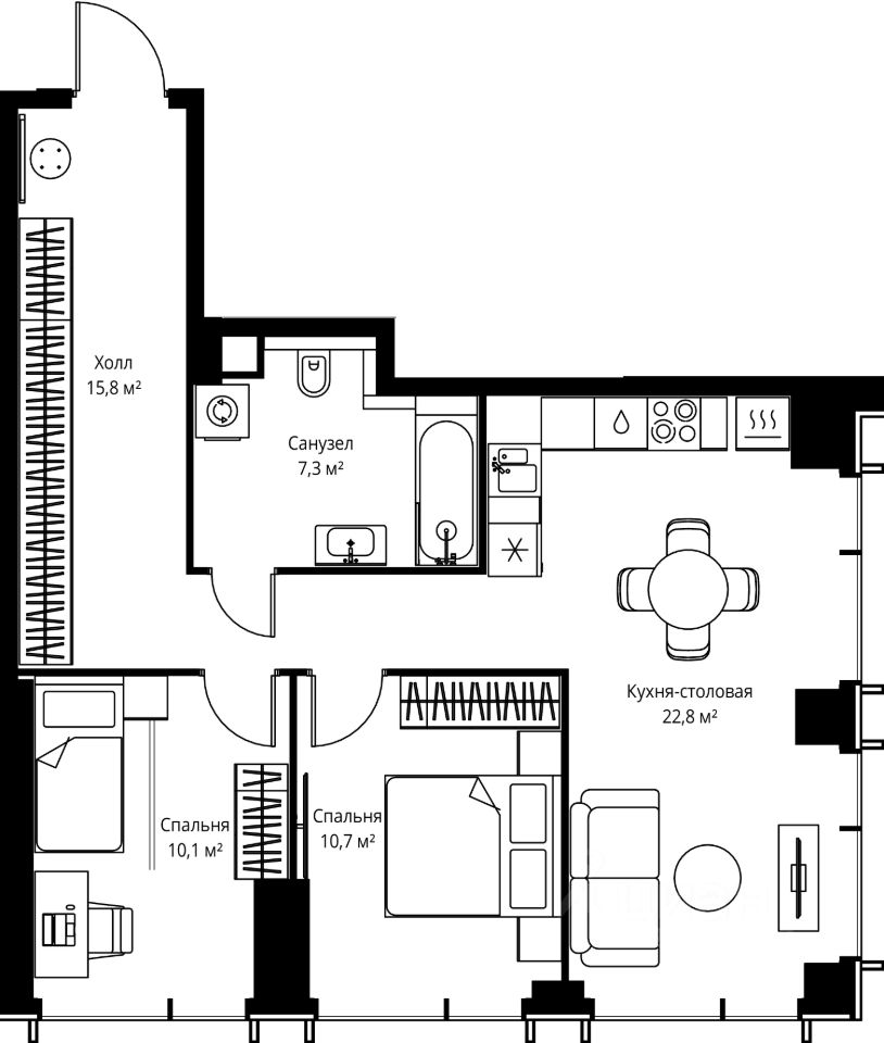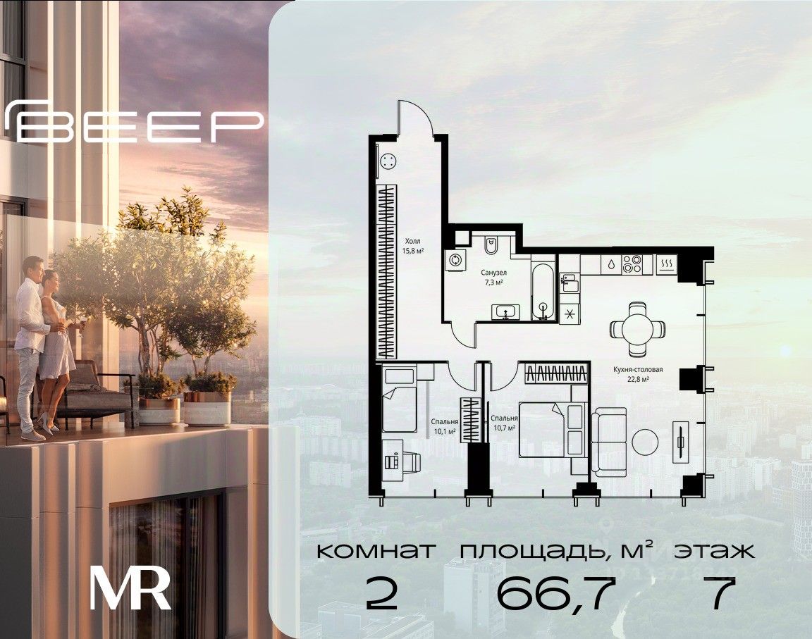 Продаётся 2-комнатная квартира общей площадью 66.70 м² без отделки в ЖК Веер на 7-м этаже 59 этажного дома.
