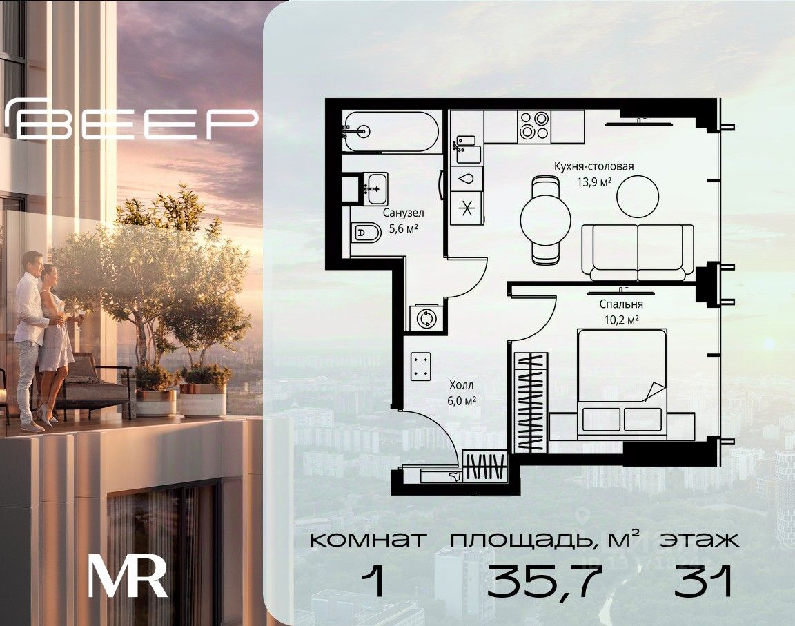 Продаётся 1-комнатная квартира общей площадью 35.70 м² без отделки в ЖК Веер на 31-м этаже 59 этажного дома.