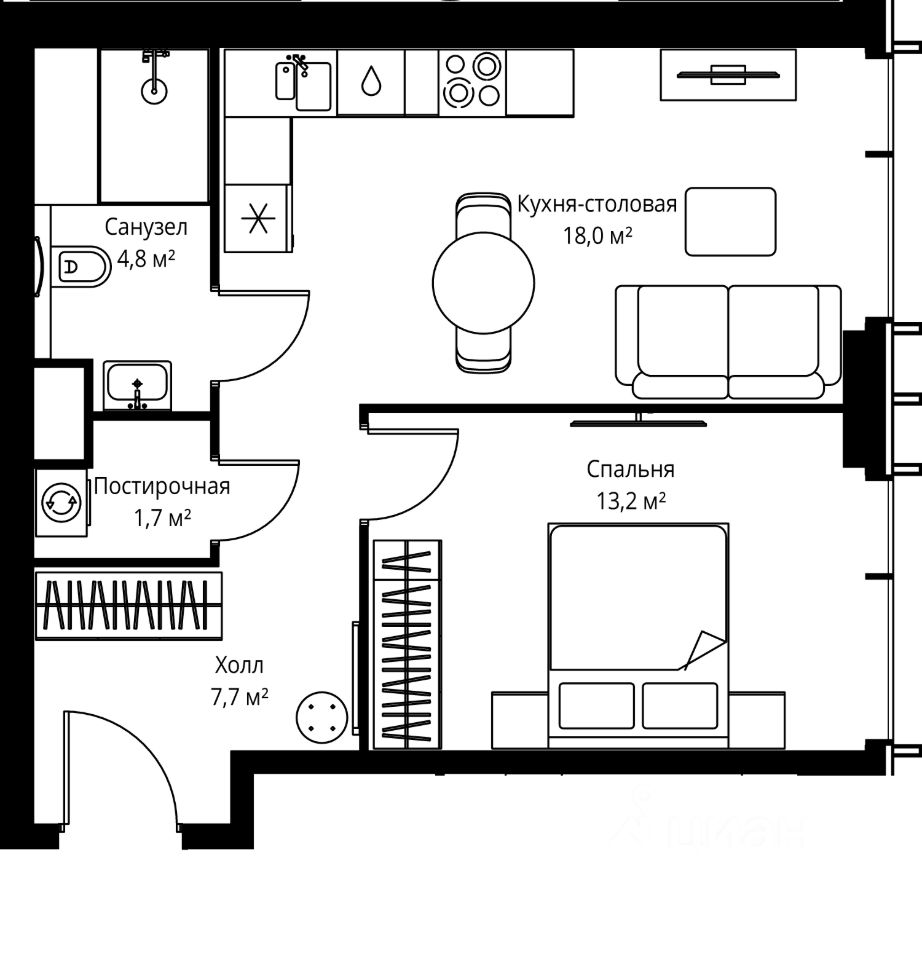 Продаётся 1-комнатная квартира общей площадью 45.40 м² без отделки в ЖК Веер на 16-м этаже 59 этажного дома.