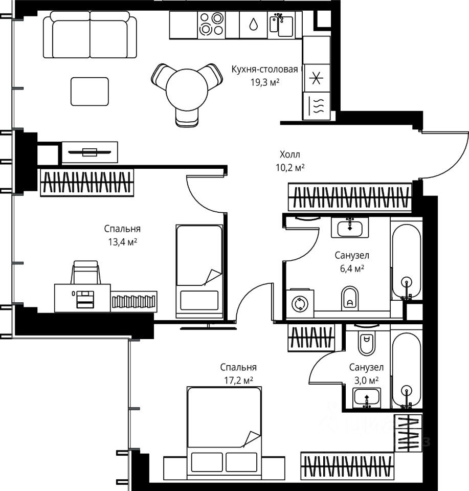 Продаётся 2-комнатная квартира общей площадью 69.50 м² без отделки в ЖК Веер на 46-м этаже 59 этажного дома.