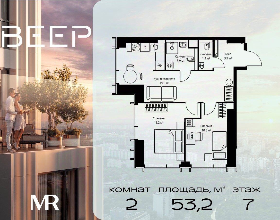 Продаётся 2-комнатная квартира общей площадью 53.20 м² без отделки в ЖК Веер на 7-м этаже 59 этажного дома.
