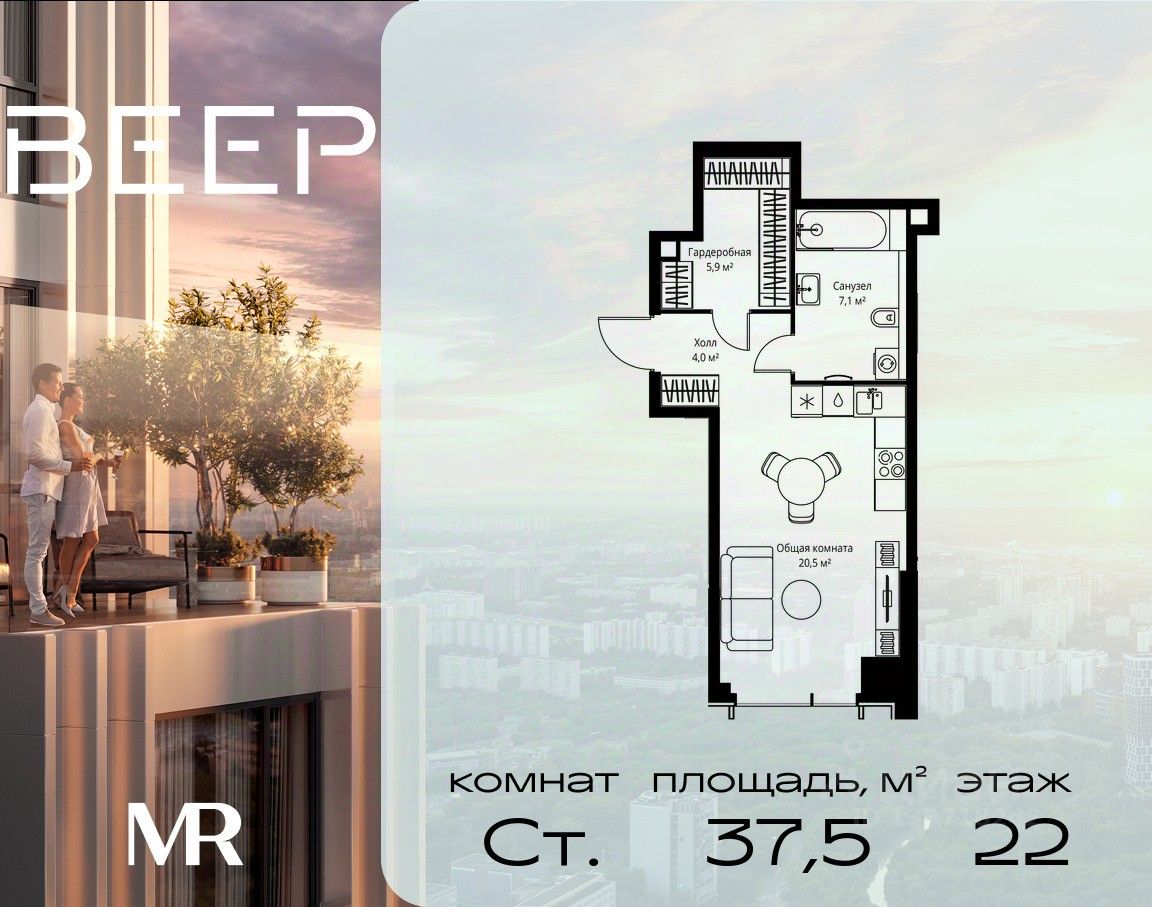Продаётся студия общей площадью 37.50 м² без отделки в ЖК Веер на 22-м этаже 59 этажного дома.