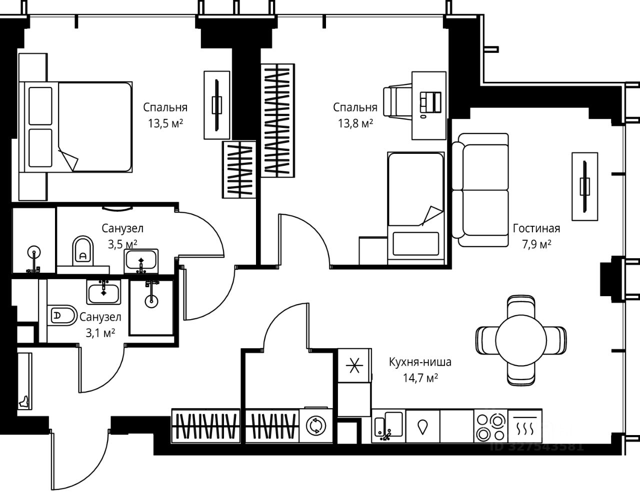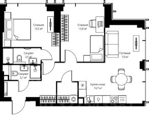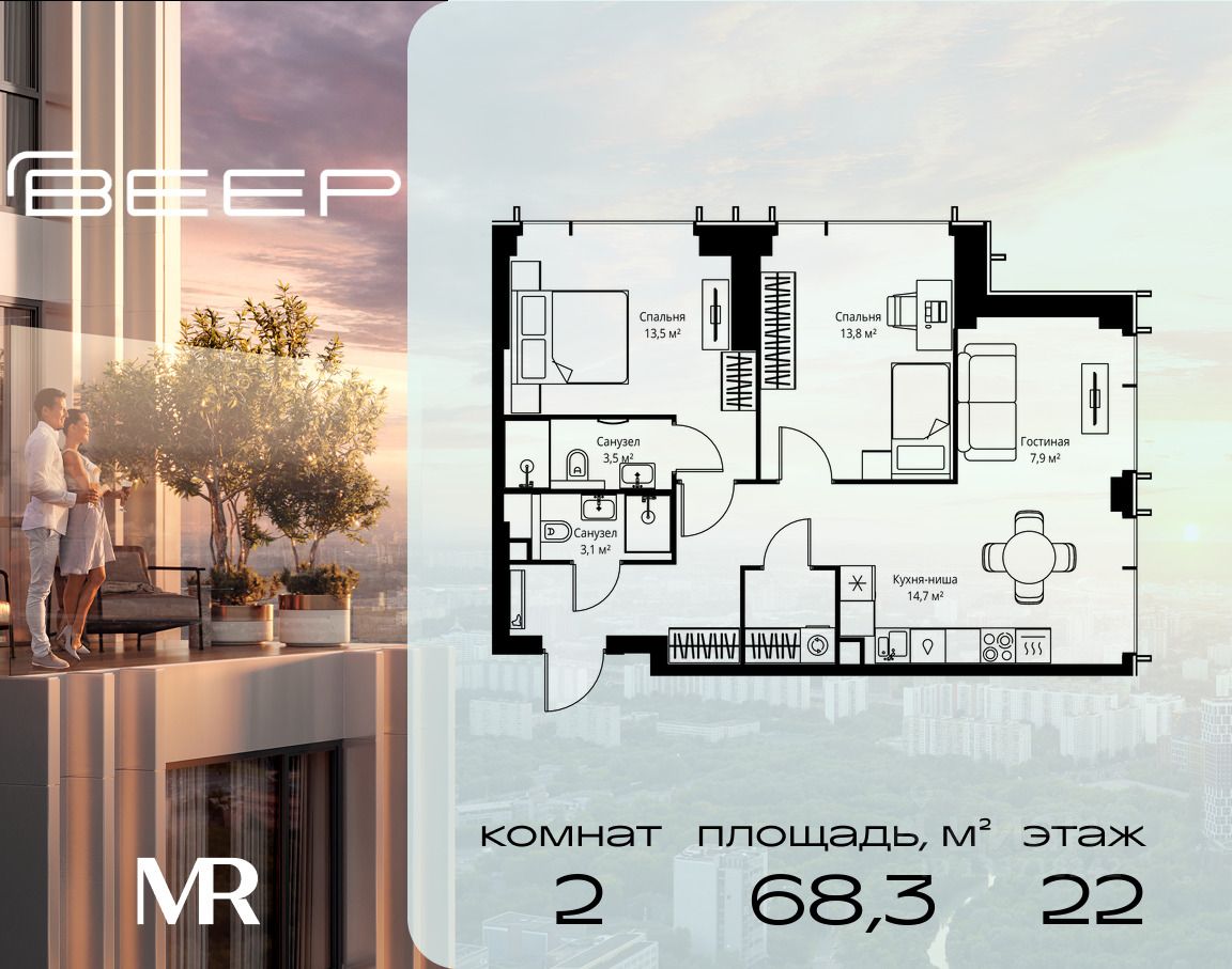 Продаётся 2-комнатная квартира общей площадью 68.30 м² без отделки в ЖК Веер на 22-м этаже 59 этажного дома.