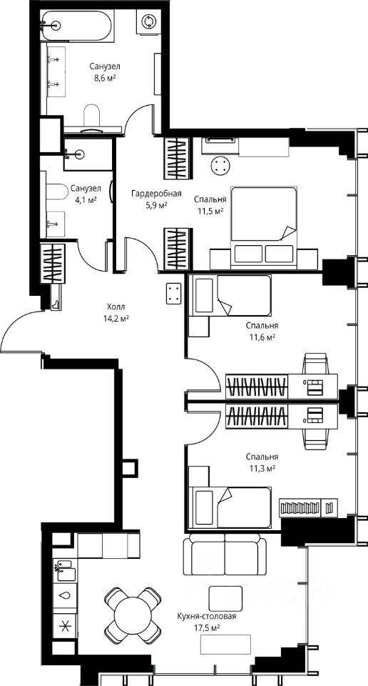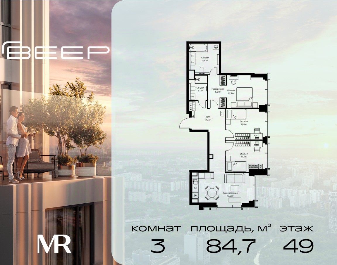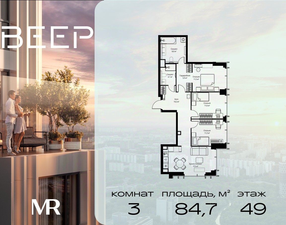 Продаётся 3-комнатная квартира общей площадью 84.70 м² без отделки в ЖК Веер на 49-м этаже 59 этажного дома.