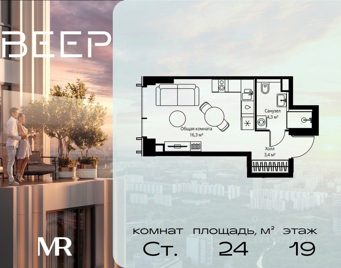 Продаётся студия общей площадью 24 м² без отделки в ЖК Веер на 19-м этаже 59 этажного дома.