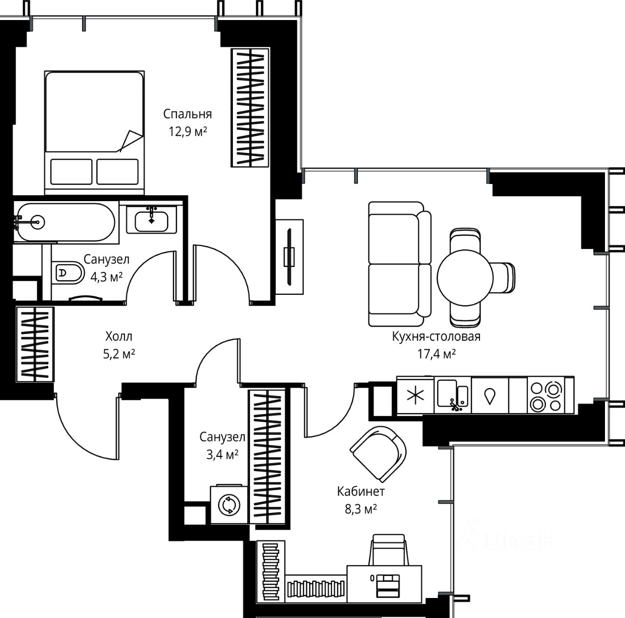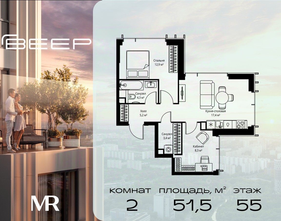 Продаётся 2-комнатная квартира общей площадью 51.50 м² без отделки в ЖК Веер на 55-м этаже 59 этажного дома.