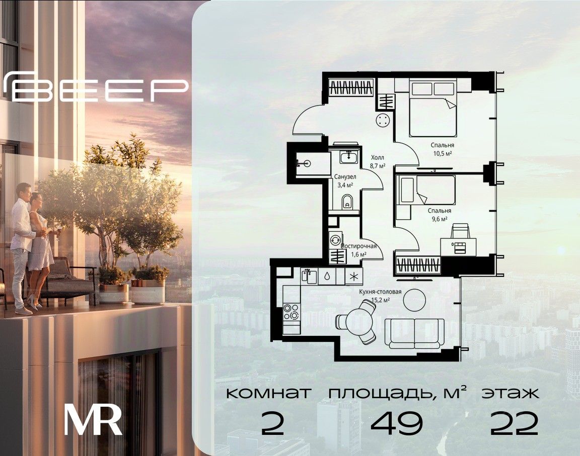 Продаётся 2-комнатная квартира общей площадью 49 м² без отделки в ЖК Веер на 22-м этаже 59 этажного дома.