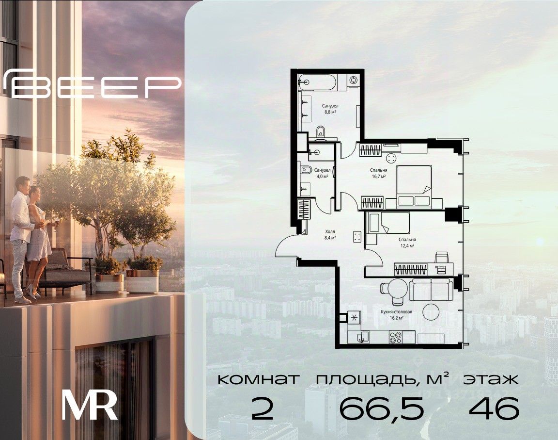 Продаётся 2-комнатная квартира общей площадью 66.50 м² без отделки в ЖК Веер на 46-м этаже 59 этажного дома.