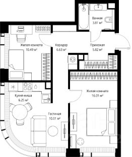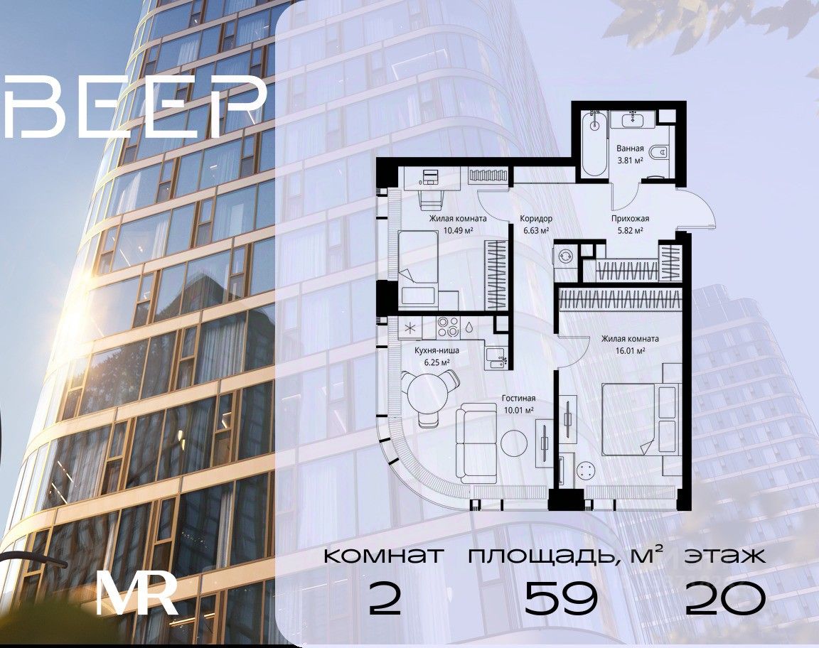 Продаётся 2-комнатная квартира общей площадью 59.02 м² без отделки в ЖК Веер на 20-м этаже 25 этажного дома.