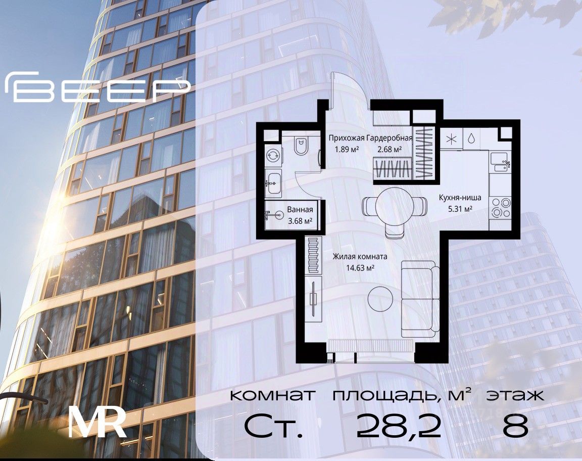 Продаётся студия общей площадью 28.19 м² без отделки в ЖК Веер на 8-м этаже 25 этажного дома.