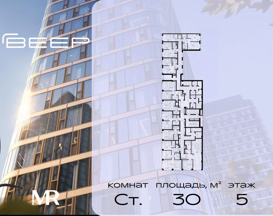 Продаётся студия общей площадью 30.03 м² без отделки в ЖК Веер на 5-м этаже 70 этажного дома.