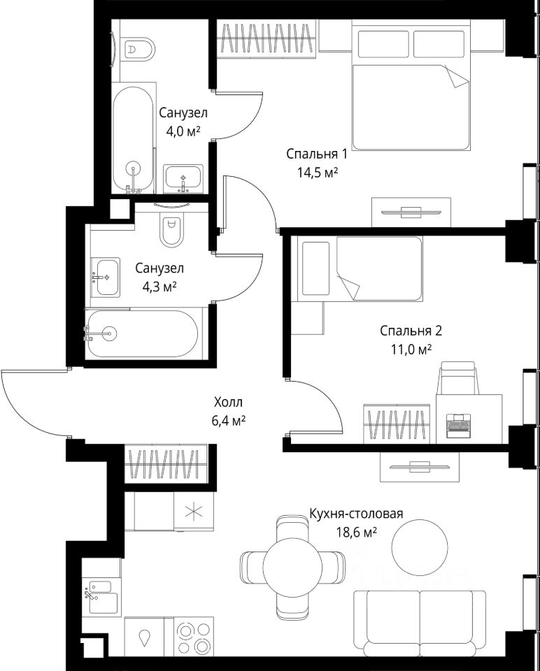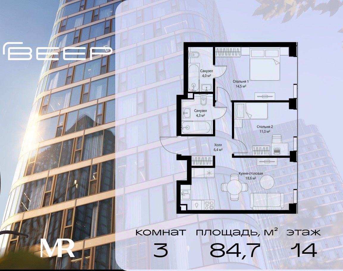 Продаётся 3-комнатная квартира общей площадью 84.73 м² без отделки в ЖК Веер на 14-м этаже 70 этажного дома.