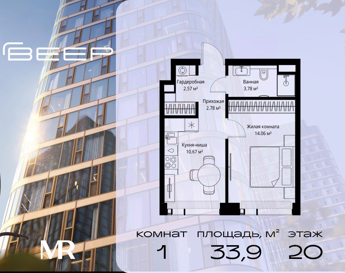 Продаётся 1-комнатная квартира общей площадью 33.86 м² без отделки в ЖК Веер на 20-м этаже 25 этажного дома.