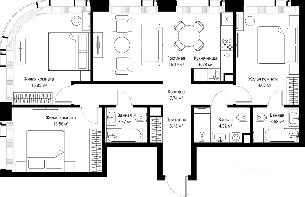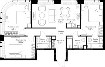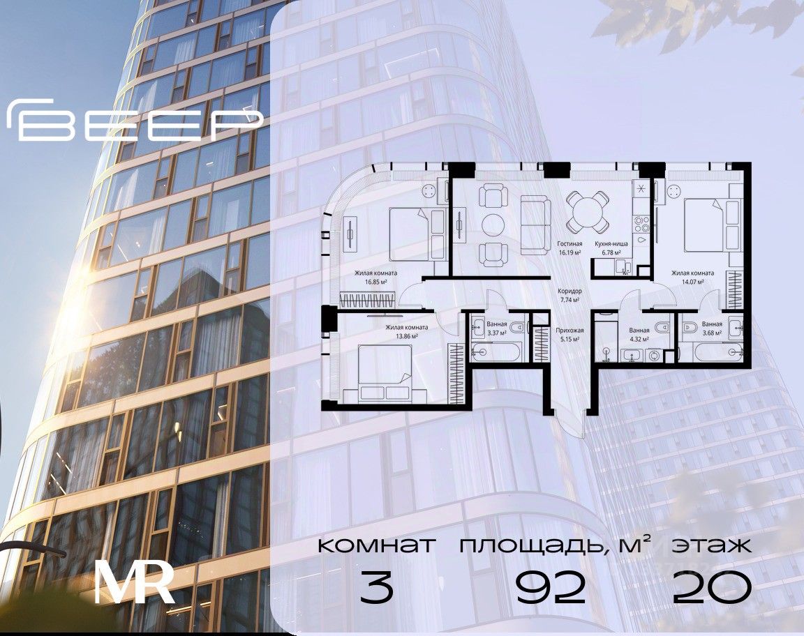 Продаётся 3-комнатная квартира общей площадью 92.01 м² без отделки в ЖК Веер на 20-м этаже 25 этажного дома.