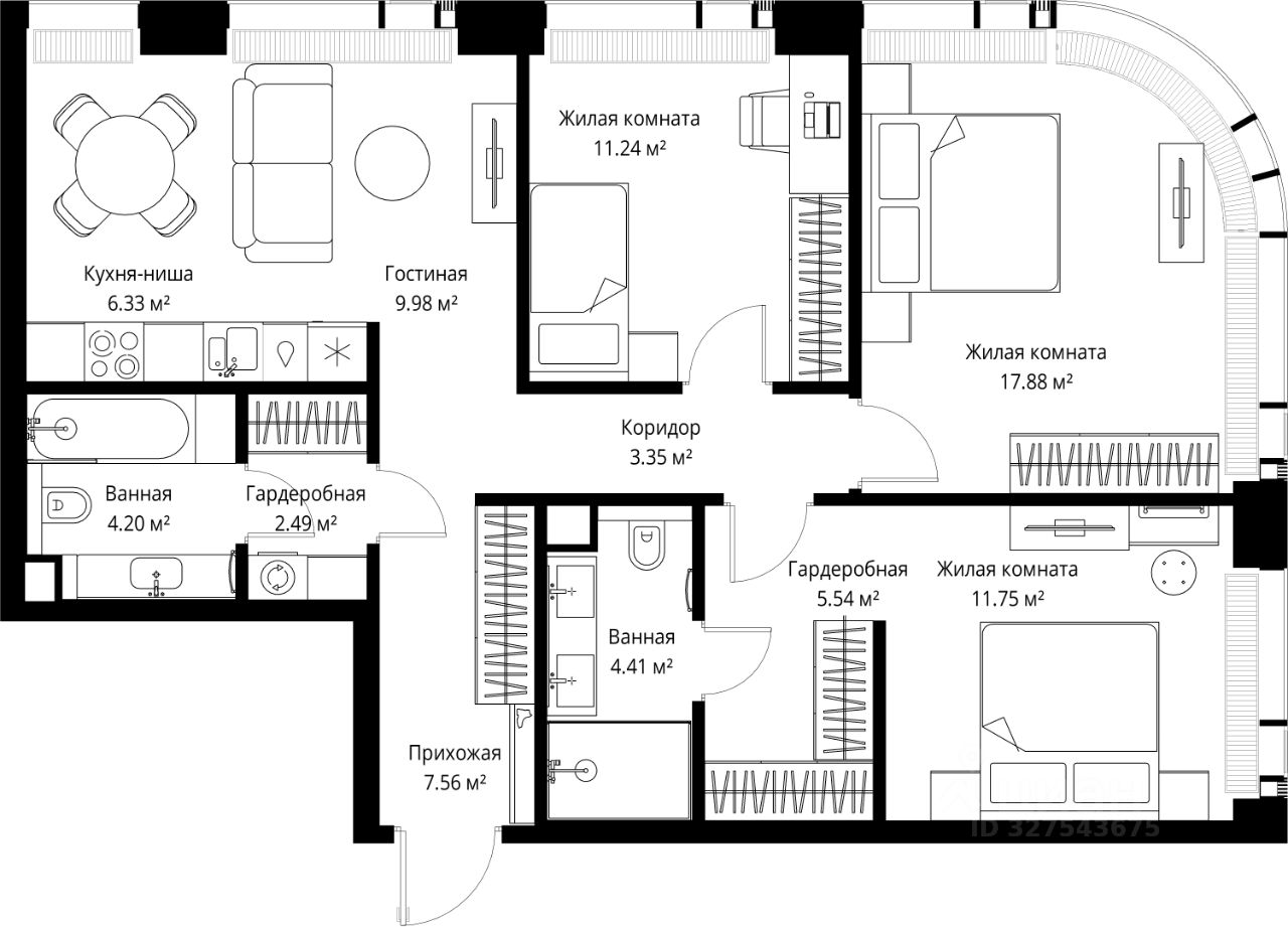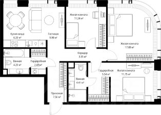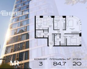 Продаётся 3-комнатная квартира общей площадью 84.73 м² без отделки в ЖК Веер на 20-м этаже 25 этажного дома.