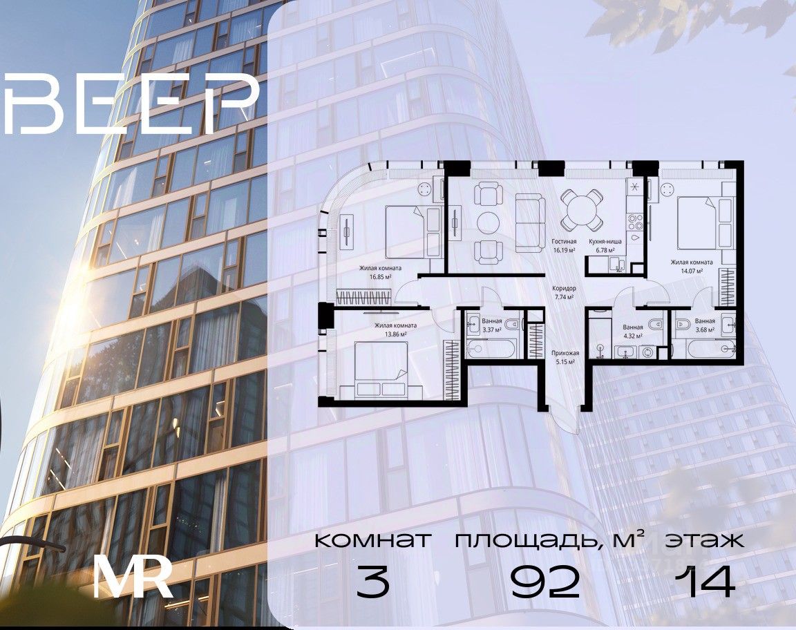 Продаётся 3-комнатная квартира общей площадью 92.01 м² без отделки в ЖК Веер на 14-м этаже 70 этажного дома.