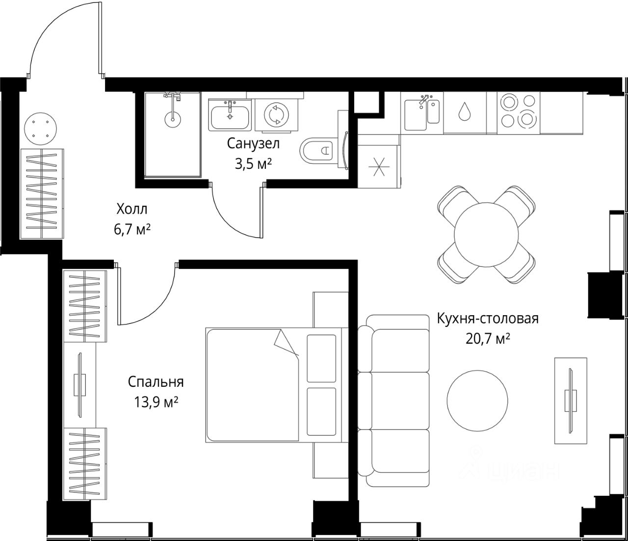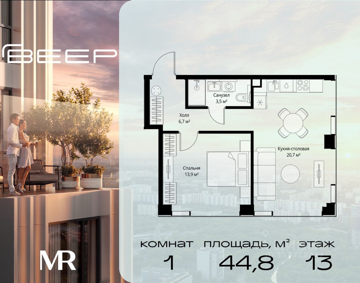 Продаётся 1-комнатная квартира общей площадью 44.80 м² с предчистовой отделкой в ЖК Веер на 13-м этаже 22 этажного дома.