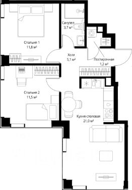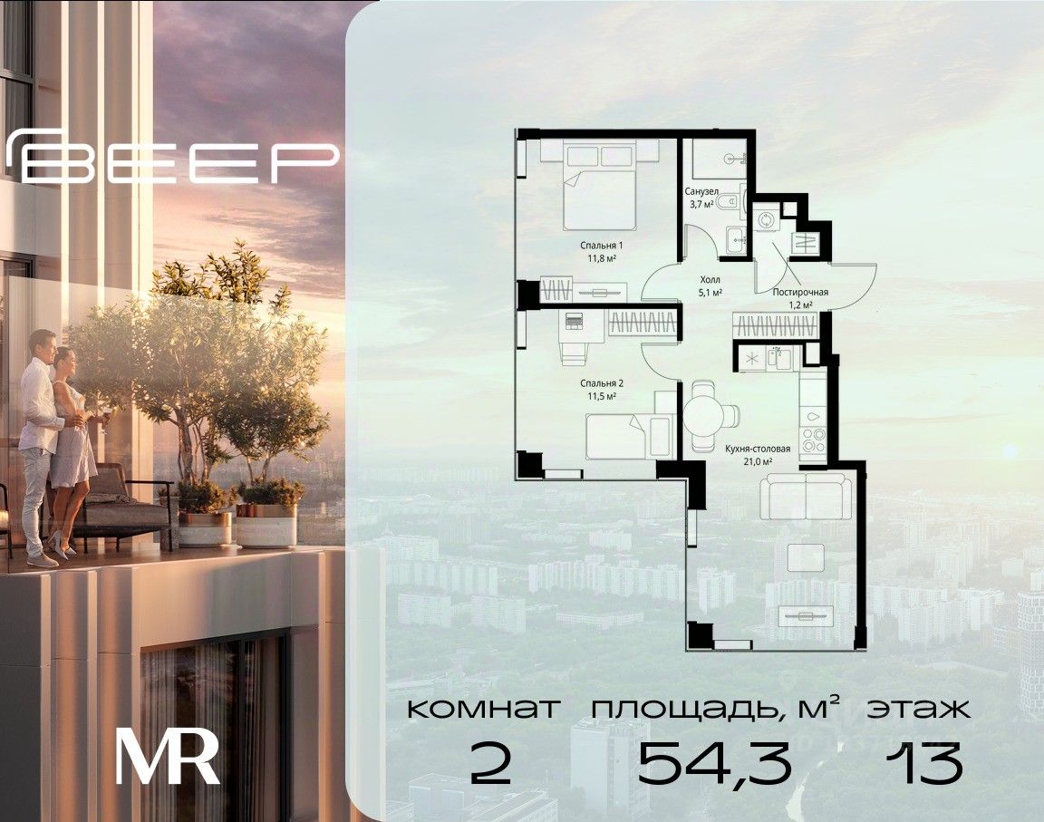 Продаётся 2-комнатная квартира общей площадью 54.30 м² с предчистовой отделкой в ЖК Веер на 13-м этаже 22 этажного дома.