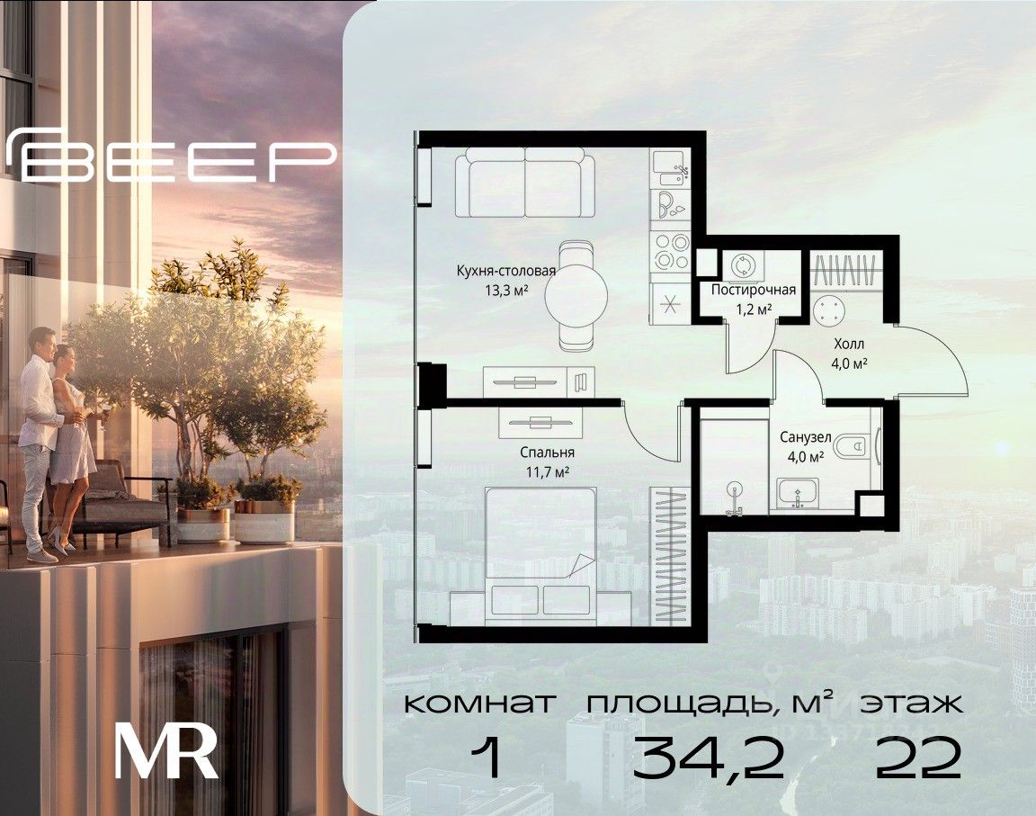 Продаётся 1-комнатная квартира общей площадью 34.20 м² с предчистовой отделкой в ЖК Веер на 22-м этаже 22 этажного дома.