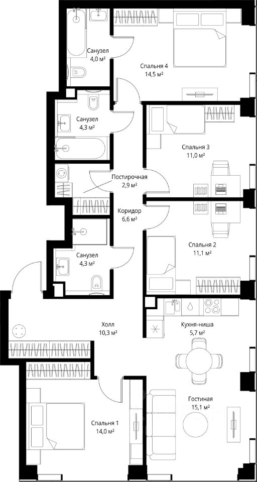 Продаётся 4-комнатная квартира общей площадью 103.80 м² с предчистовой отделкой в ЖК Веер на 7-м этаже 22 этажного дома.