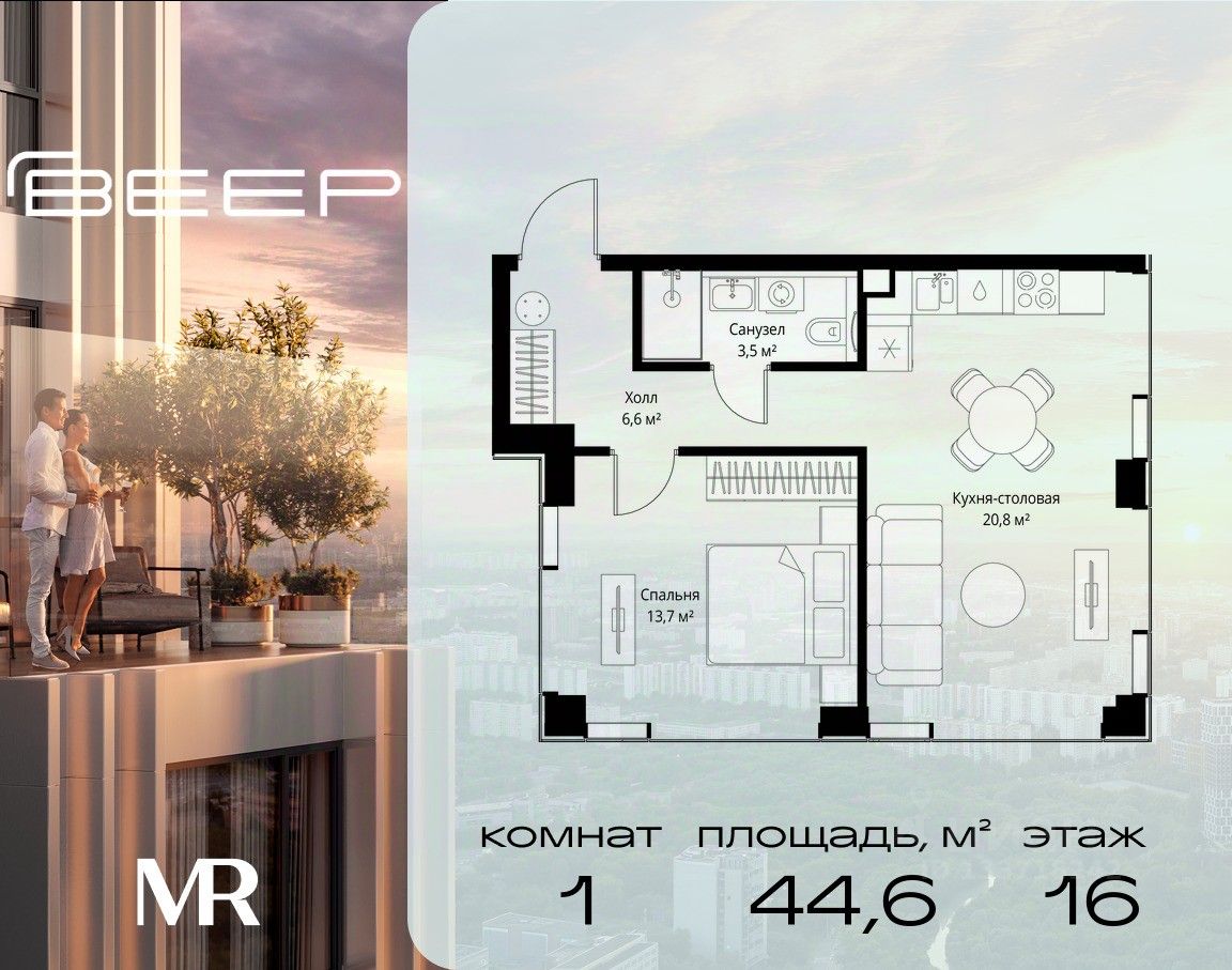 Продаётся 1-комнатная квартира общей площадью 44.60 м² с предчистовой отделкой в ЖК Веер на 16-м этаже 22 этажного дома.