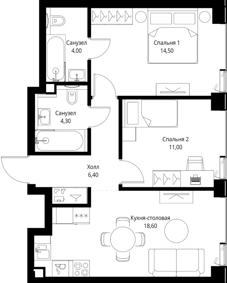 Продаётся 2-комнатная квартира общей площадью 58.80 м² с предчистовой отделкой в ЖК Веер на 13-м этаже 22 этажного дома.