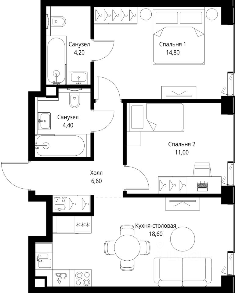 Продаётся 2-комнатная квартира общей площадью 59.60 м² с предчистовой отделкой в ЖК Веер на 22-м этаже 22 этажного дома.