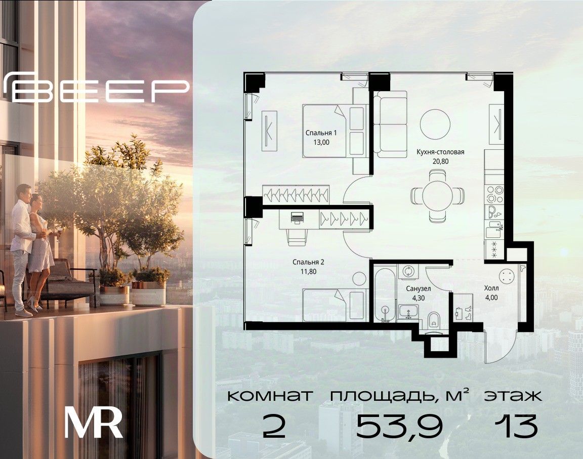 Продаётся 2-комнатная квартира общей площадью 53.90 м² с предчистовой отделкой в ЖК Веер на 13-м этаже 22 этажного дома.