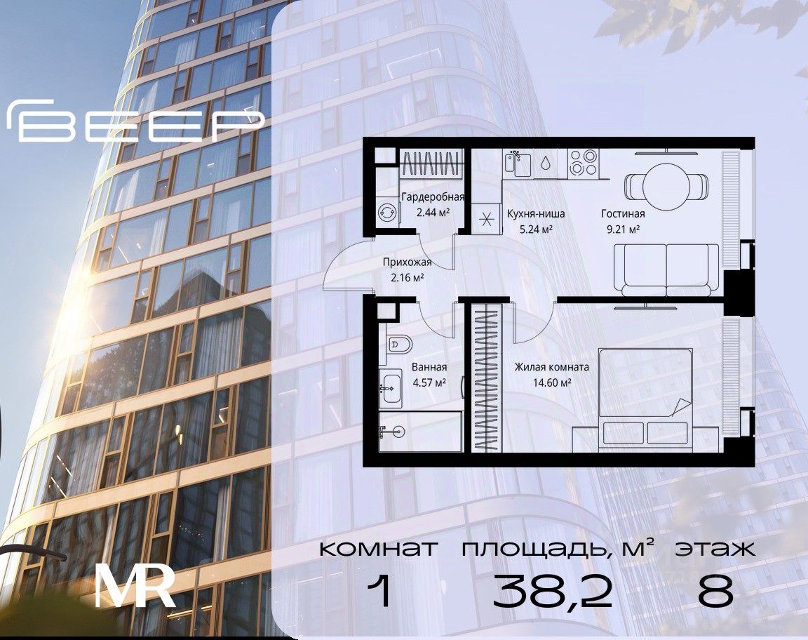 Продаётся 1-комнатная квартира общей площадью 38.22 м² без отделки в ЖК Веер на 8-м этаже 35 этажного дома.