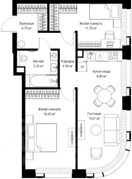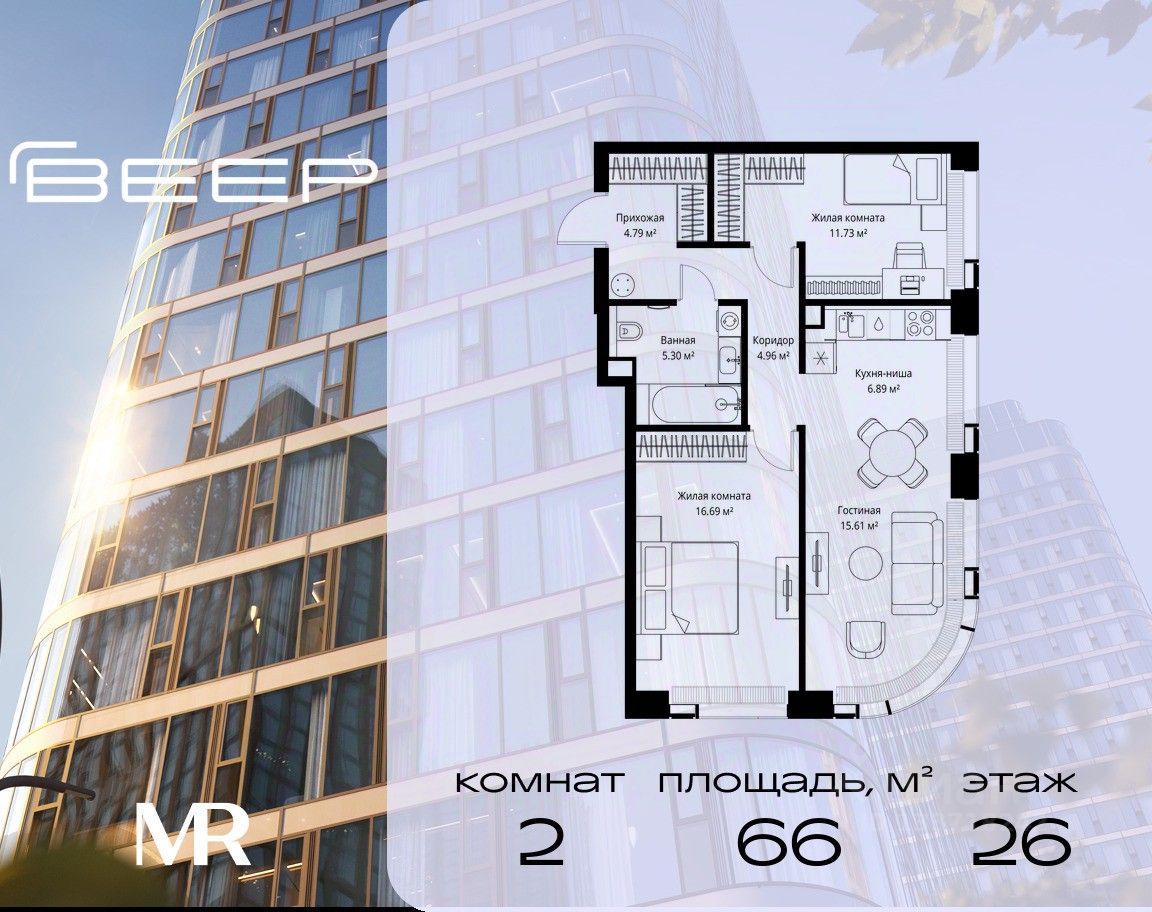 Продаётся 2-комнатная квартира общей площадью 65.97 м² без отделки в ЖК Веер на 26-м этаже 35 этажного дома.