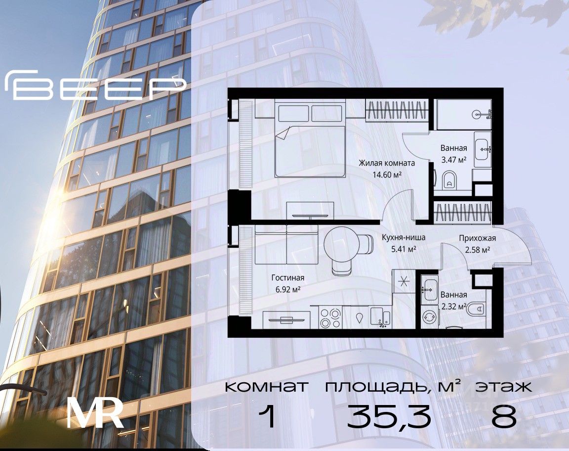 Продаётся 1-комнатная квартира общей площадью 35.30 м² без отделки в ЖК Веер на 8-м этаже 35 этажного дома.