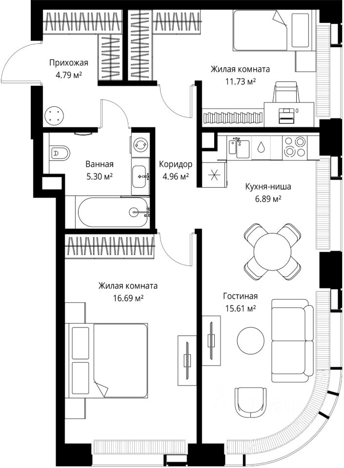 Продаётся 2-комнатная квартира общей площадью 65.97 м² без отделки в ЖК Веер на 17-м этаже 35 этажного дома.