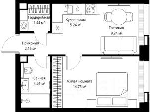 Продаётся 1-комнатная квартира общей площадью 38.44 м² без отделки в ЖК Веер на 26-м этаже 35 этажного дома.