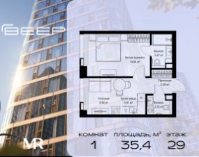 Продаётся 1-комнатная квартира общей площадью 35.36 м² без отделки в ЖК Веер на 29-м этаже 35 этажного дома.
