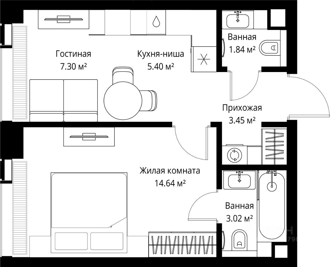 Продаётся 1-комнатная квартира общей площадью 35.65 м² без отделки в ЖК Веер на 26-м этаже 35 этажного дома.
