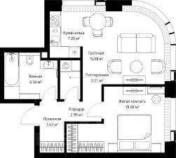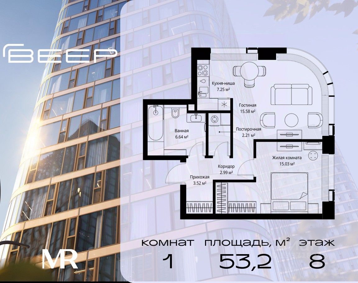 Продаётся 1-комнатная квартира общей площадью 53.22 м² без отделки в ЖК Веер на 8-м этаже 35 этажного дома.