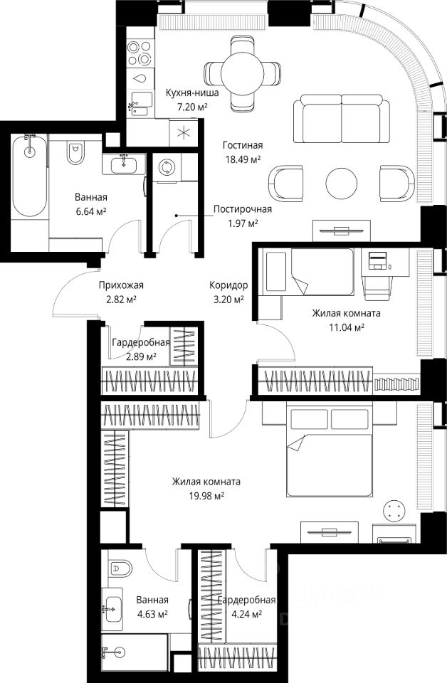 Продаётся 2-комнатная квартира общей площадью 83.10 м² без отделки в ЖК Веер на 29-м этаже 35 этажного дома.