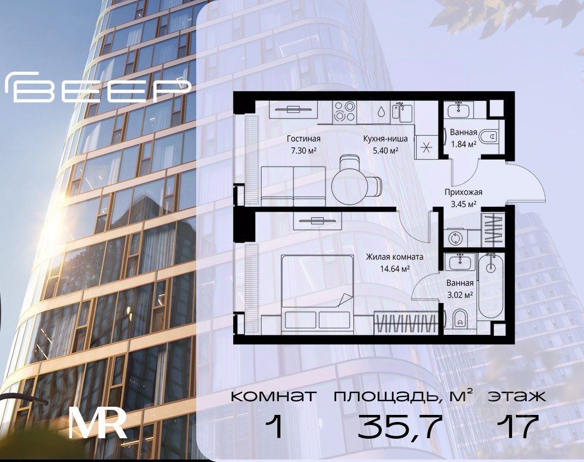 Продаётся 1-комнатная квартира общей площадью 35.65 м² без отделки в ЖК Веер на 17-м этаже 35 этажного дома.