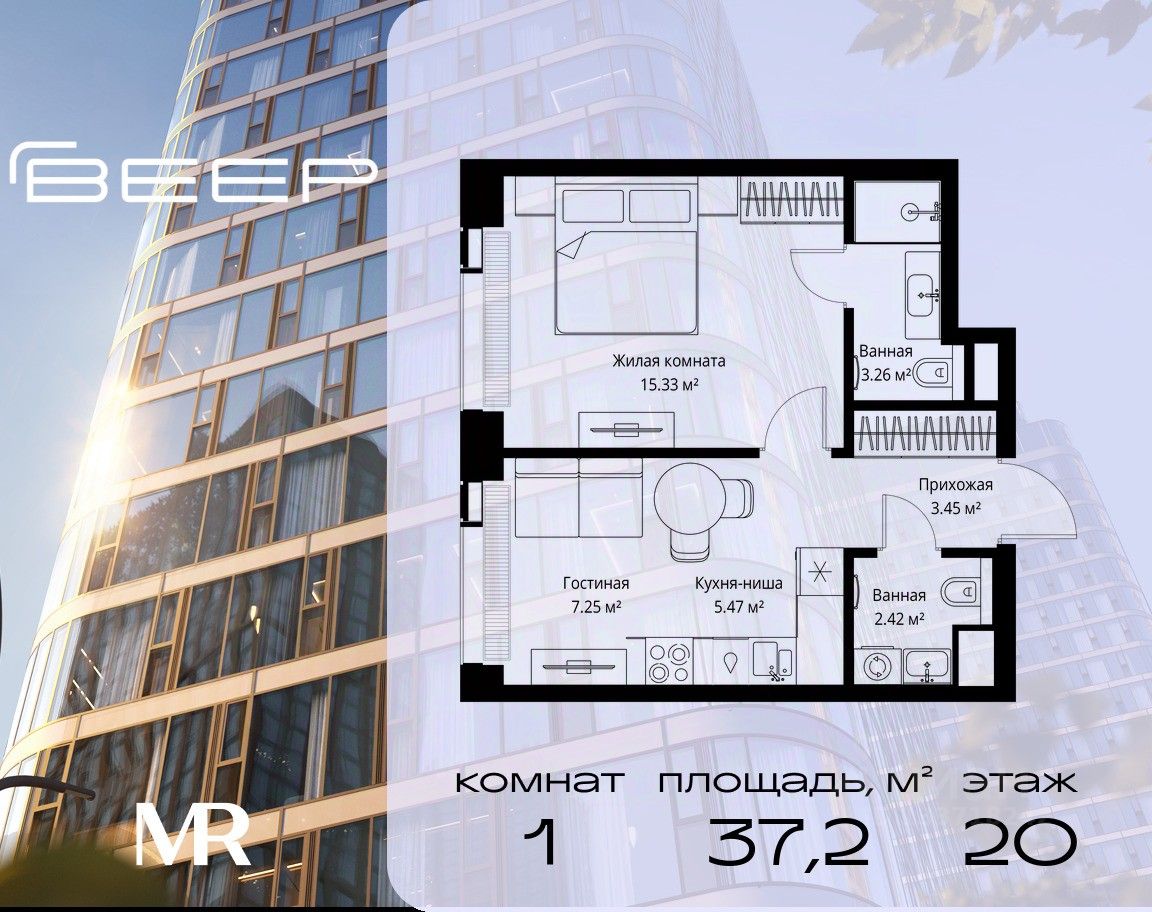 Продаётся 1-комнатная квартира общей площадью 37.18 м² без отделки в ЖК Веер на 20-м этаже 35 этажного дома.