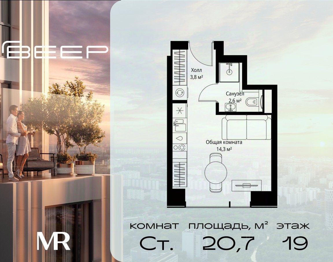 Продаётся студия общей площадью 20.70 м² с предчистовой отделкой в ЖК Веер на 19-м этаже 46 этажного дома.
