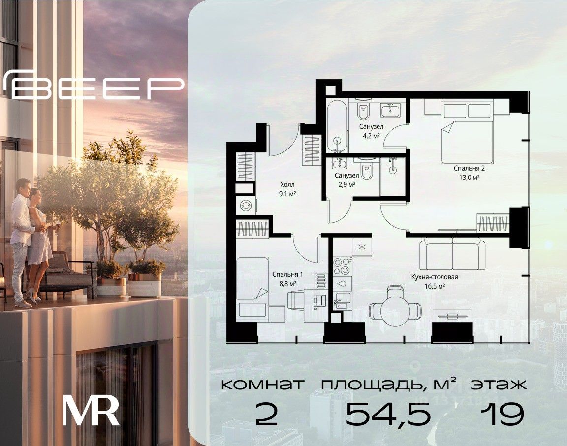 Продаётся 2-комнатная квартира общей площадью 54.50 м² с предчистовой отделкой в ЖК Веер на 19-м этаже 46 этажного дома.