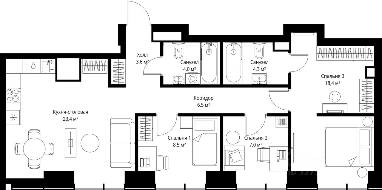 Продаётся 3-комнатная квартира общей площадью 75.70 м² без отделки в ЖК Веер на 2-м этаже 46 этажного дома.