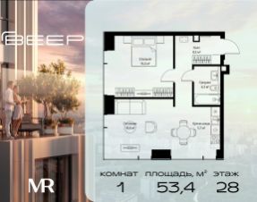 Продаётся 1-комнатная квартира общей площадью 53.40 м² с предчистовой отделкой в ЖК Веер на 28-м этаже 46 этажного дома.