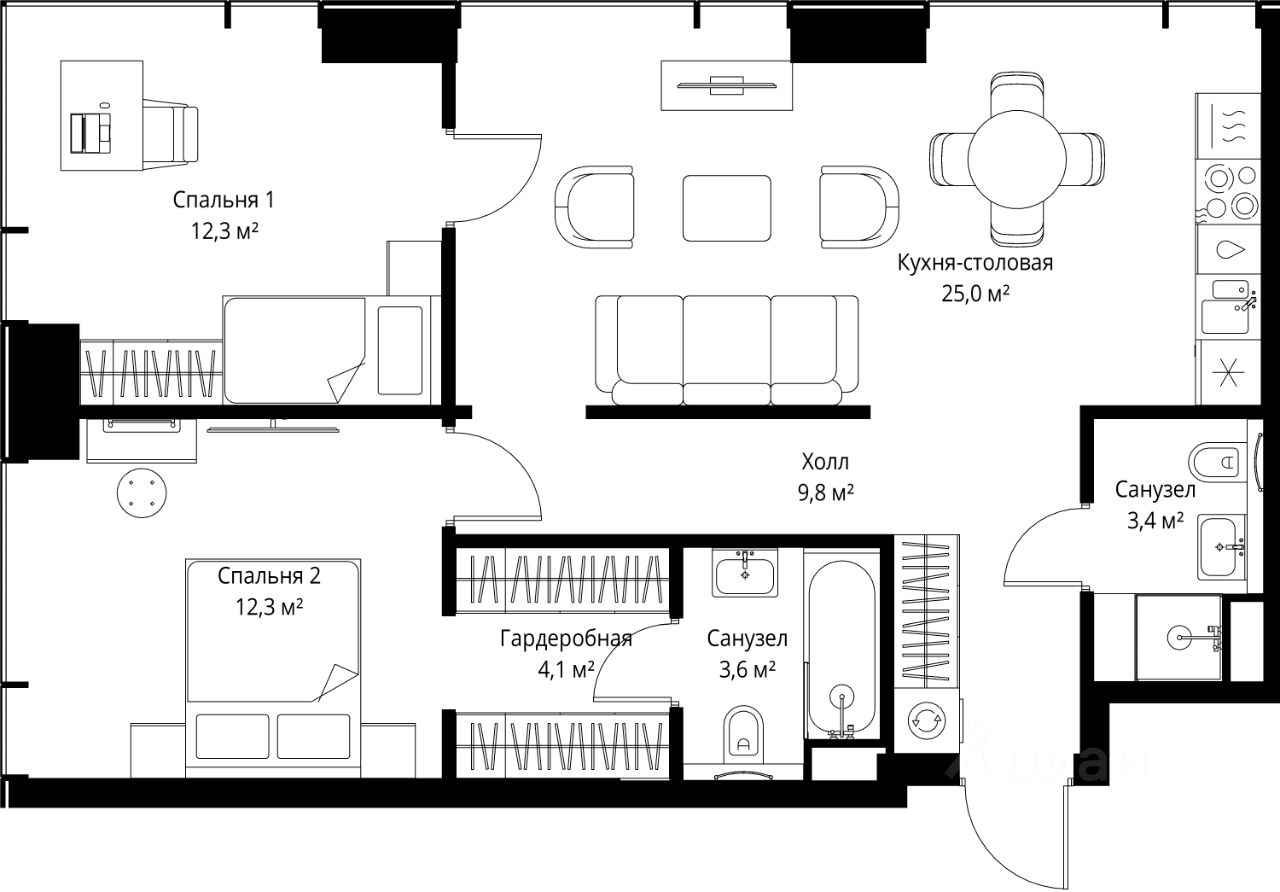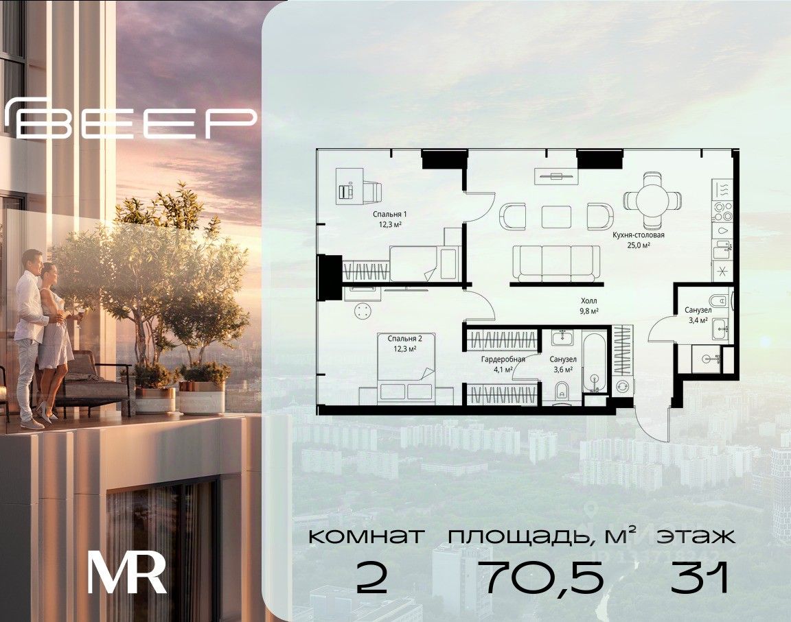 Продаётся 2-комнатная квартира общей площадью 70.50 м² с предчистовой отделкой в ЖК Веер на 31-м этаже 46 этажного дома.