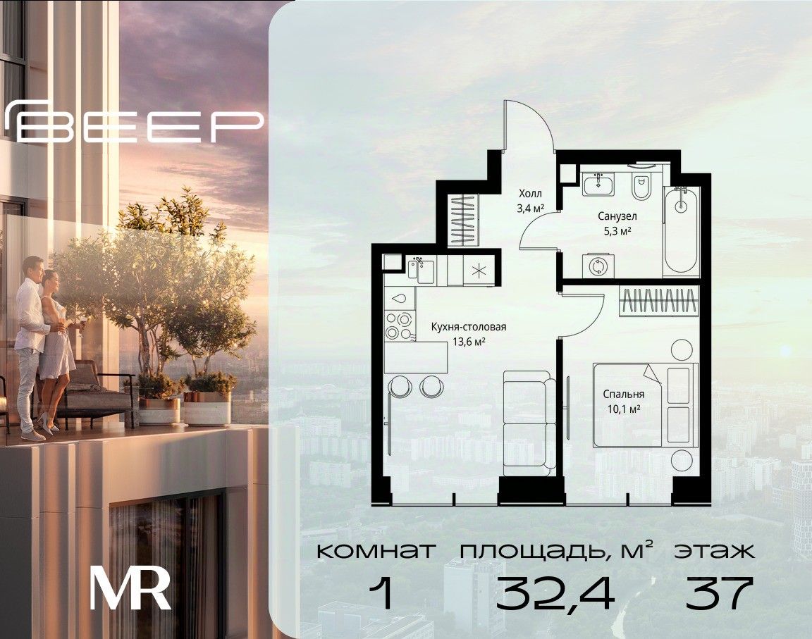 Продаётся 1-комнатная квартира общей площадью 32.40 м² с предчистовой отделкой в ЖК Веер на 37-м этаже 46 этажного дома.